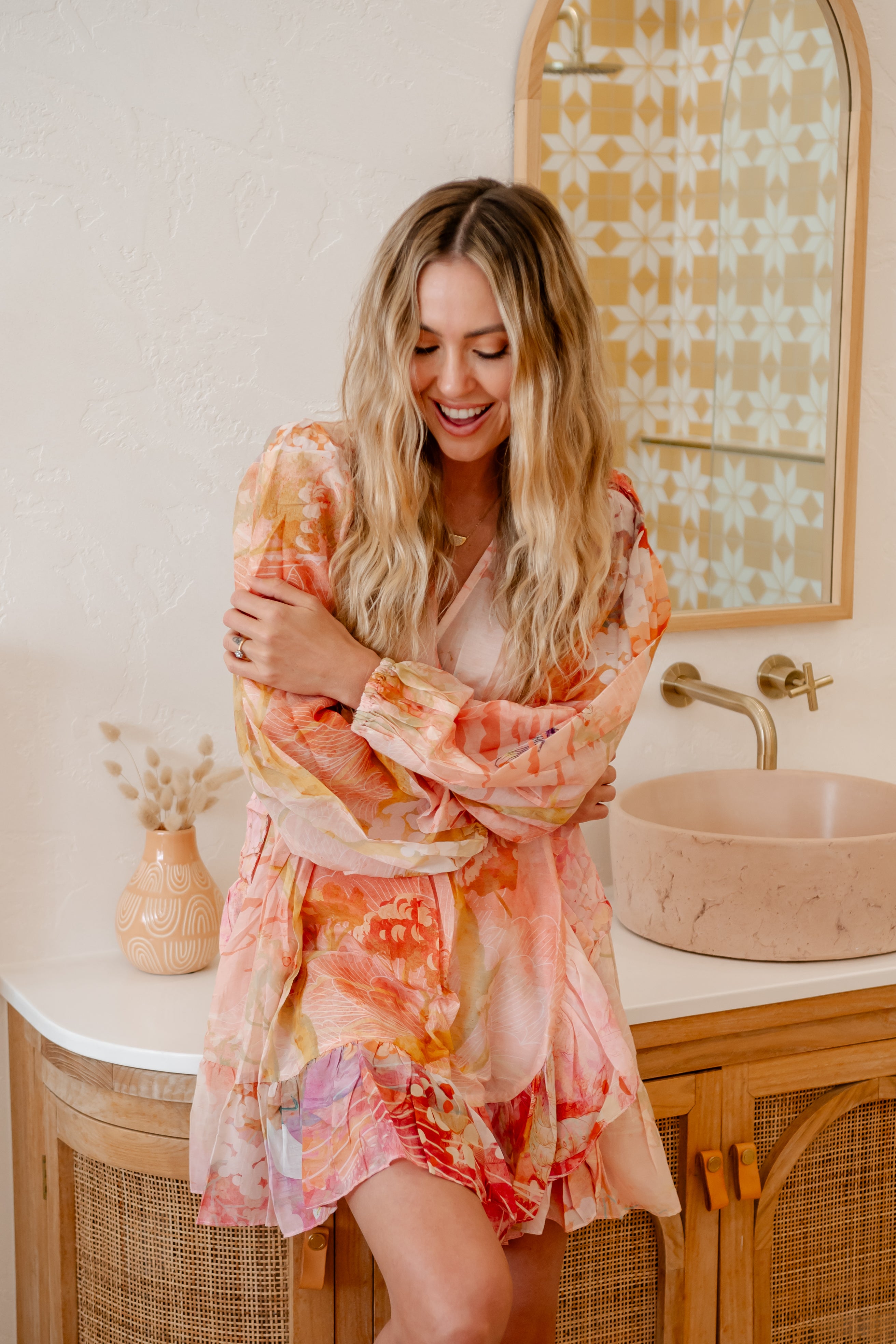 Introducing our beautiful Silk wrap mini dress in our Whimsical print.